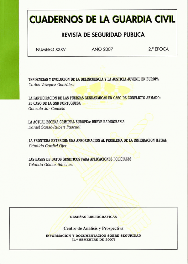 SUMARIO: Carlos Vázquez González: TENDENCIAS Y EVOLUCIÓN DE LA DELINCUENCIA Y LA JUSTICIA JUVENIL EN EUROPA -- Gonzalo Jar Couselo: LA PARTICIPACIÓN DE LAS FUERZAS GENDÁRMICAS DE CONFLICTO ARMADO: EL CASO DE LA GNR PORTUGUESA -- Daniel Sansó-Rubert Pascual: LA ACTUAL ESCENA CRIMINAL EUROPEA: BREVE RADIOGRAFÍA -- Cándido Cardiel Ojer: LA FRONTERA EXTERIOR: UNA APROXIMACIÓN AL PROBLEMA DE LA INMIGRACIÓN ILEGAL -- Yolanda Gómez Sánchez: LAS BASES DE DATOS GENÉTICOS PARA APLICACIONES POLICIALES.
