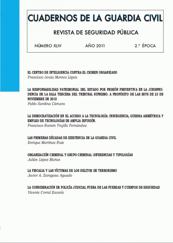 SUMARIO: Francisco Jesús Montes: EL CENTRO DE INTELIGENCIA CONTRA EL CRIMEN ORGANIZADO -- Pablo Sardina Cámara: LA RESPONSABILIDAD PATRIMONIAL DEL ESTADO POR PRISIÓN PREVENTIVA EN LA JURISPRUDENCIA DE LA SALA TERCERA DEL TRIBUNAL SUPREMO. A PROPÓSITO DE LAS SSTS DE 23 DE NOVIEMBRE DE 2010 -- Francisco Ramón Trujillo Fernández: LA DEMOCRATIZACIÓN EN EL ACCESO A LA TECNOLOGÍA: GUERRA ASIMÉTRICA Y EMPLEO DE TECNOLOGÍAS DE AMPLIA DIFUSIÓN -- Enrique Martínez Ruiz: LAS PRIMERAS DÉCADAS DE EXISTENCIA DE LA GUARDIA CIVIL -- Julián López Muñoz: ORGANIZACIÓN CRIMINAL Y GRUPO CRIMINAL: DIFERENCIAS Y TIPOLOGÍAS -- Javier A. Zaragoza Aguado: LA FISCALÍA Y LAS VÍCTIMAS DE LOS DELITOS DE TERRORISMO -- Vicente Corral: LA CONSIDERACIÓN DE POLICÍA JUDICIAL FUERA DE LAS FUERZAS Y CUERPOS DE SEGURIDAD.
