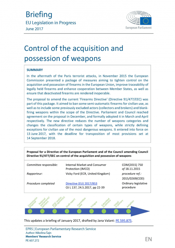 legally held firearms and enhance cooperation between Member States, as well as ensure that deactivated firearms are rendered inoperable. The proposal to amend the current 'Firearms Directive' (Directive 91/477/EEC) was part of this package. It aimed to ban some semi-automatic firearms for civilian use, as well asto include some previously excluded actors (collectors and brokers) and blankfiring weapons within the scope of the Directive. Parliament and Council reached agreement on the proposal in December, and formally adopted it in March and April respectively. The new directive reduces the number of weapons categories and changes the classification of certain types of weapons, while strictly defining exceptions for civilian use of the most dangerous weapons. It entered into force on 13 June 2017, with the deadline for transposition of most provisions set at 14 September 2018.