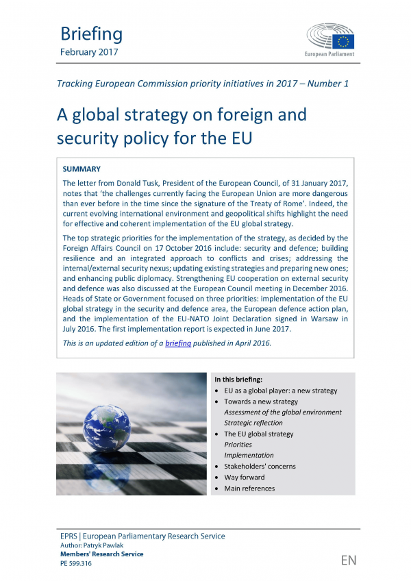 for effective and coherent implementation of the EU global strategy. The top strategic priorities for the implementation of the strategy, as decided by the Foreign Affairs Council on 17 October 2016 include: security and defence; building