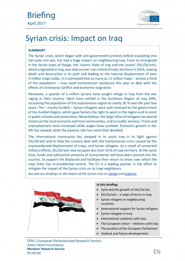 The Syrian crisis, which began with anti-government protests before escalating into full-scale civil war, has had a huge impact on neighbouring Iraq. From its stronghold in the Syrian town of Raqqa, the 'Islamic State of Iraq and the Levant' (ISIL/Da'esh), which originated in Iraq, was able to over-run a third of Iraq's territory in 2014, sowing death and destruction in its path and leading to the internal displacement of over 3 million Iraqis today. It is estimated that as many as 11 million Iraqis ─ almost a third of the population ─ may need humanitarian assistance this year to deal with the effects of continuous conflict and economic stagnation. Moreover, a quarter of a million Syrians have sought refuge in Iraq from the war raging in their country. Most have settled in the Kurdistan Region of Iraq (KRI), increasing the population of this autonomous region by nearly 30 % over the past few years. The ─ mostly Kurdish ─ Syrian refugees were well received by the government of the Kurdish Region, which gave Syrians the right to work in the region and to enrol in public schools and universities. Nevertheless, the large influx of refugees has placed strains on the local economy and host communities, and on public services. Prices and unemployment have increased while wages have tumbled. Economic growth in the KRI has slowed, while the poverty rate has more than doubled. The international community has stepped in to assist Iraq in its fight against ISIL/Da'esh and to help the country deal with the humanitarian crisis caused by the unprecedented displacement of Iraqis, and Syrian refugees. As a result of concerted military efforts, ISIL/Da'esh now occupies less than 10 % of Iraqi territory. At the same time, funds and substantial amounts of humanitarian aid have been poured into the country, to support the displaced and facilitate their return to areas over which the Iraqi State has re-established control. The EU is a leading partner in the effort to mitigate the impact of the Syrian crisis on its Iraqi neighbours.