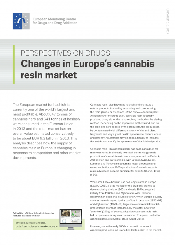 The European market for hashish is currently one of the world’s largest and most profitable. About 647 tonnes of cannabis herb and 641 tonnes of hashish were consumed in the Euroean Union in 2013 and the retail market has an overall value estimated conservatively to be about EUR 9.3 billion in 2013. This analysis describes how the supply of cannabis resin in Europe is changing in response to competition and other market developments.