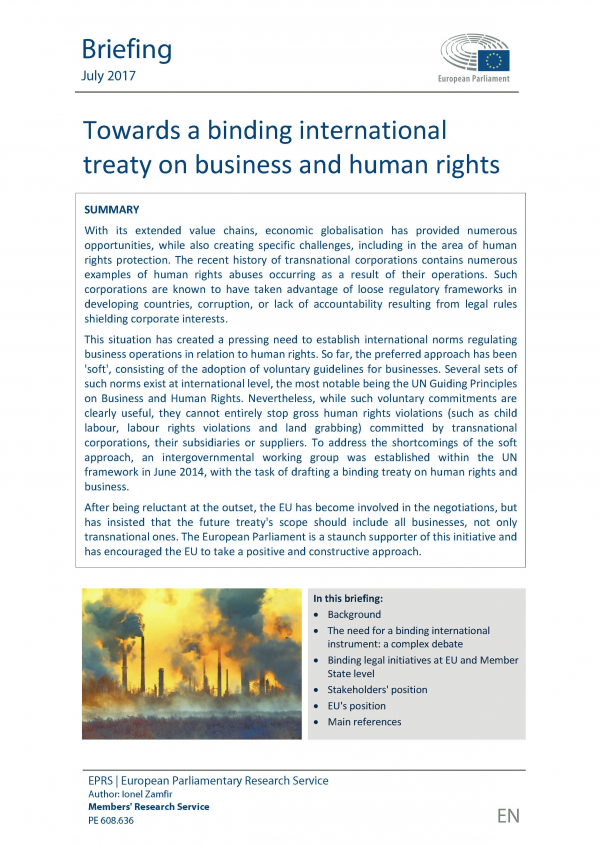 TextSeries: BriefingPublication details: European Parliamentary Research Service July 2017Description: 12 p. Recurso onlineSubject(s): Online resources: Summary: With its extended value chains, economic globalisation has provided numerous opportunities, while also creating specific challenges, including in the area of human rights protection. The recent history of transnational corporations contains numerous examples of human rights abuses occurring as a result of their operations. Such corporations are known to have taken advantage of loose regulatory frameworks in developing countries, corruption, or lack of accountability resulting from legal rules shielding corporate interests. This situation has created a pressing need to establish international norms regulating business operations in relation to human rights. So far, the preferred approach has been