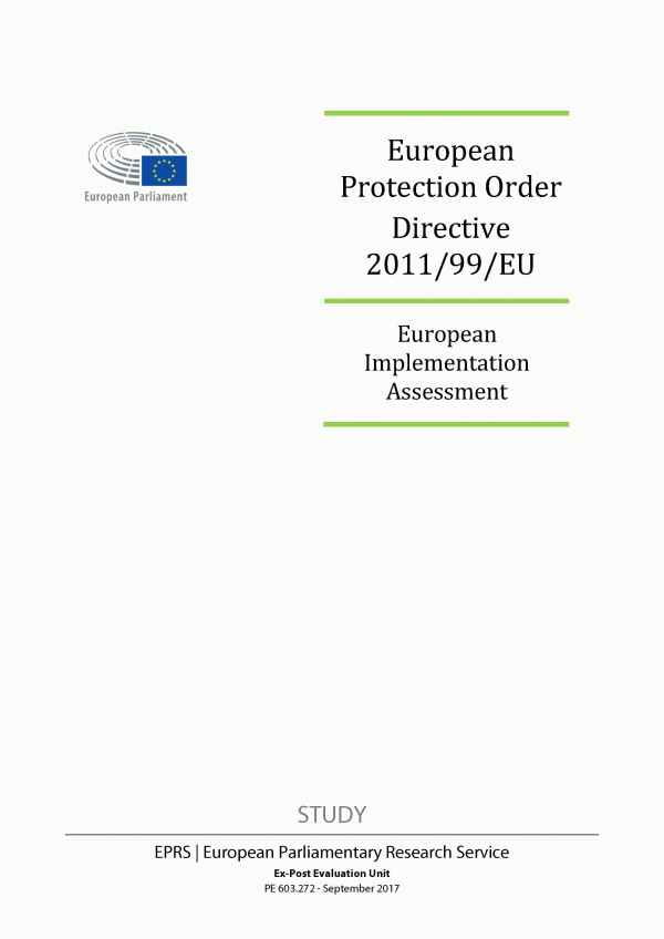 This European implementation assessment examines the implementation of Directive 2011/99/EU on the European Protection Order (EPO), a mechanism for the mutual recognition of protection measures of victims of crime, which had to be transposed into the national legislation of the Member States by 11 January 2015. The assessment analyses the practices of the Member States, identifies a number of issues that help to explain why there has been very limited use of the EPO to date, and offers recommendations on how the implementation of the EPO directive might be improved.