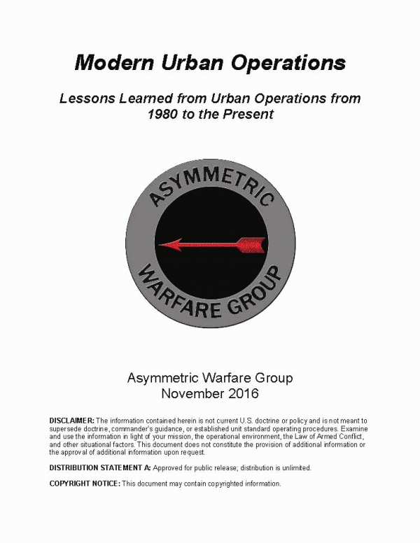 TextPublication details: November 2016 2282 Morrison St., Ste. 5355 • Ft. Meade, MD 20755-5355 Asymmetric Warfare Group ReportDescription: 39 pSubject(s): Online resources: Summary: Urban warfare is not a new phenomenon. The U. S. Army saw urban combat in the Revolutionary War, the War of 1812, the Civil War, and elsewhere. Starting with World War II, overall armed conflict began to occur around centers with a high population density. This new backdrop for conflict has caused a whole new set of challenge, especially in an era of public scrutiny. The "Army's capacity to engage, fight, and win major urban combat operations will determine the success of future operational and strategic endeavors".