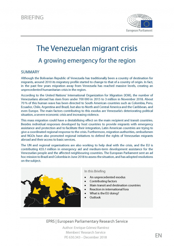 TextSeries: Briefing ; PE 630.343Publication details: European Parliamentary Research Service December 2018Description: 12 p. Recurso onlineSubject(s): Online resources: Summary: Although the Bolivarian Republic of Venezuela has traditionally been a country of destination for migrants, around 2010 its migratory profile started to change to that of a country of origin. In fact, in the past few years migration away from Venezuela has reached massive levels, creating an unprecedented humanitarian crisis in the region.