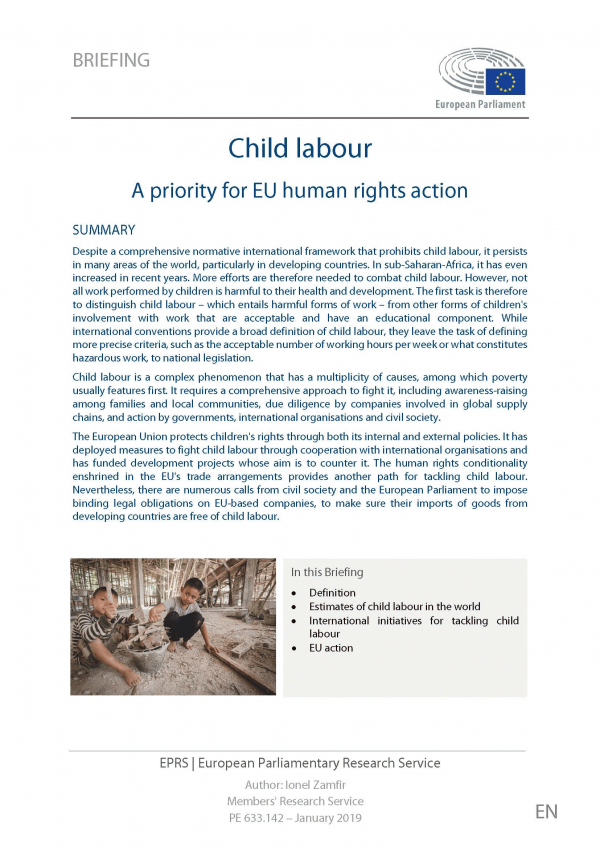 The European Union protects children's rights through both its internal and external policies. It has deployed measures to fight child labour through cooperation with international organisations and has funded development projects whose aim is to counter it. The human rights conditionality enshrined in the EU's trade arrangements provides another path for tackling child labour. Nevertheless, there are numerous calls from civil society and the European Parliament to impose binding legal obligations on EU-based companies, to make sure their imports of goods from developing countries are free of child labour.