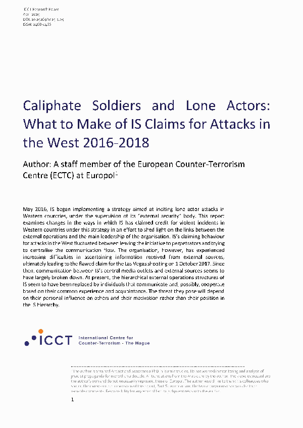 Caliphate Soldiers and Lone Actors [Recurso electrónico] PDF : What to Make of IS Claims for Attacks in the West 2016-2018