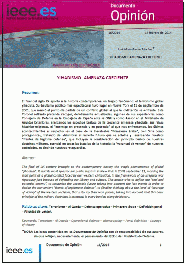 ArticleSeries: Documento de Opinión IEEE ; 16/2014 Publication details: Instituto Español de Estudios Estrategicos Febrero 2014Description: Recurso online, 17 p. 579,58 KBSubject(s): Online resources: Summary: El final del siglo XX aportó a la historia contemporánea un trágico fenómeno: el terrorismo global yihadista. Su bautismo público más espectacular tuvo lugar en Nueva York el 11 de septiembre de 2001, que marcó el punto de partida de un conflicto global al que la civilización se enfrenta. Este Coronel retirado pretende recoger, debidamente actualizadas, algunas de sus experiencias como Consejero de Defensa en la Embajada de España ante la ONU y como Asesor en el Ministerio de Asuntos Exteriores, analizando los aspectos básicos de la creciente amenaza yihadista, sus raíces histórico-religiosas, el “enemigo en presencia y en potencia” al que nos enfrentamos, los últimos acontecimientos al respecto -es el caso de la inacabable “Primavera árabe”, con Siria como protagonista-, tratando de vislumbrar el incierto futuro que se adivina y analizando nuestros “frentes de legítima defensa”, que incluyen la consideración del principio básico de nuestras doctrinas militares, esencial en todas las batallas de la historia: la “voluntad de vencer” de nuestras sociedades, es decir de nuestras retaguardias.
