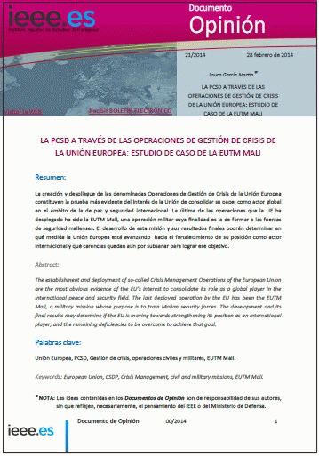 La creación y despliegue de las denominadas Operaciones de Gestión de Crisis de la Unión Europea constituyen la prueba más evidente del interés de la Unión de consolidar su papel como actor global en el ámbito de la de paz y seguridad internacional. La última de las operaciones que la UE ha desplegado ha sido la EUTM Mali, una operación militar cuya finalidad es la de formar a las fuerzas de seguridad malienses. El desarrollo de esta misión y sus resultados finales podrán determinar en qué medida la Unión Europea está avanzando hacia el fortalecimiento de su posición como actor internacional y qué carencias quedan aún por subsanar para lograr ese objetivo.